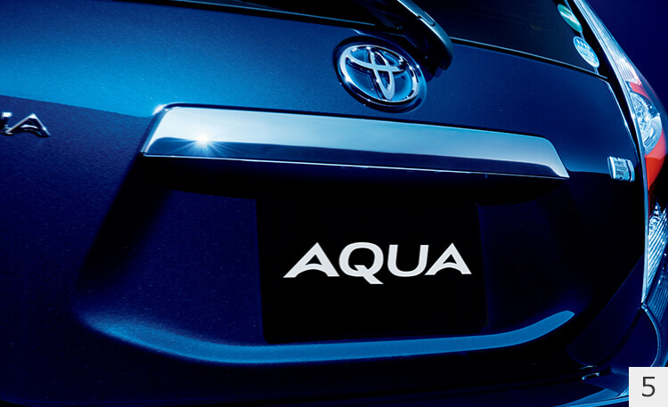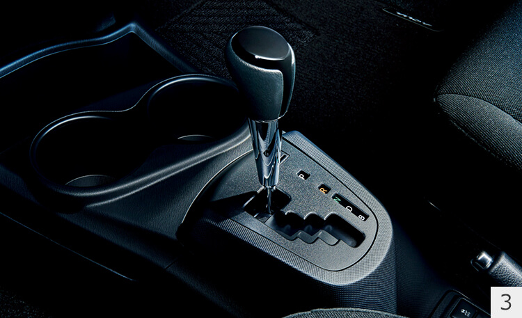1: ファブリックシート表皮(ブラック) 2: 合成皮革巻きインパネ助手席オーナメント/サイドレジスターリング(シルバー塗装) 3: シフトノブ(上部ブラック加飾) 4: メッキアウトサイドドアハンドル 5:メッキバックドアガーニッシュ