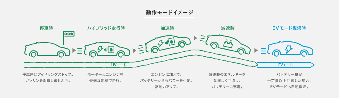 ■エンジン、駆動用バッテリーの状態、エアコンの使用状況や運転方法(急加速・所定の車速を超える)、道路状況(登坂)などによっては、バッテリー残量に関わらずEV走行が解除され、エンジンが作動します。