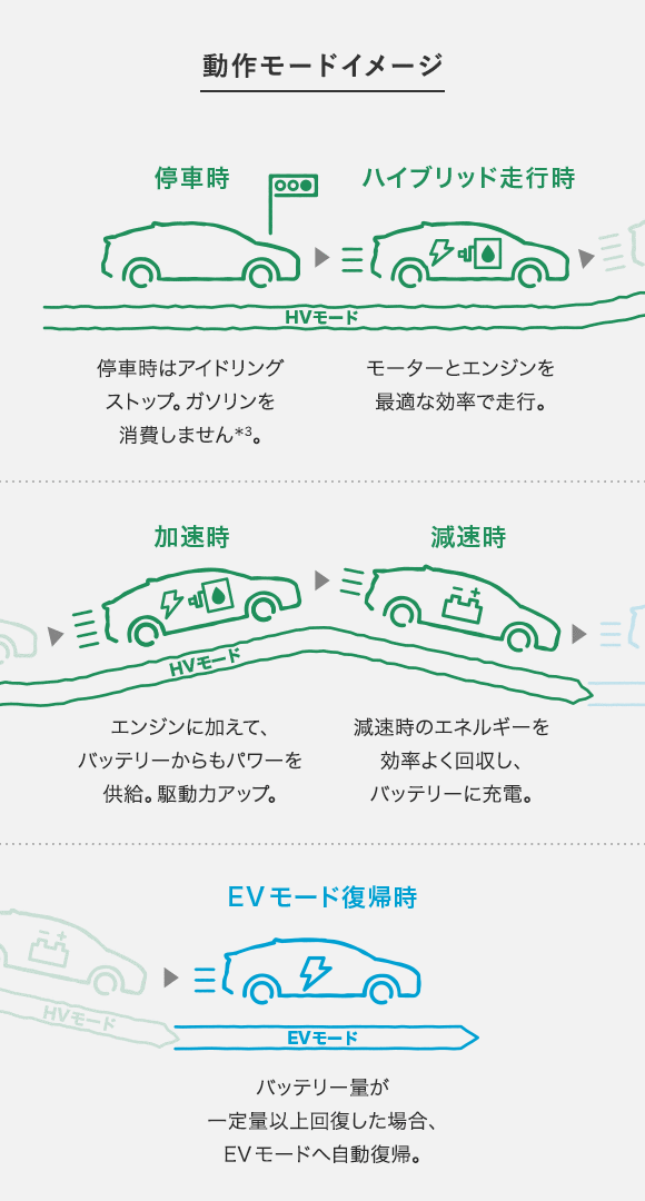 ■充電電力使用時走行距離は定められた試験条件のもとでの値です。お客様の使用環境(気象、渋滞等)や運転方法(急発進、エアコン使用等)に応じてEV走行距離は大きく異なります。